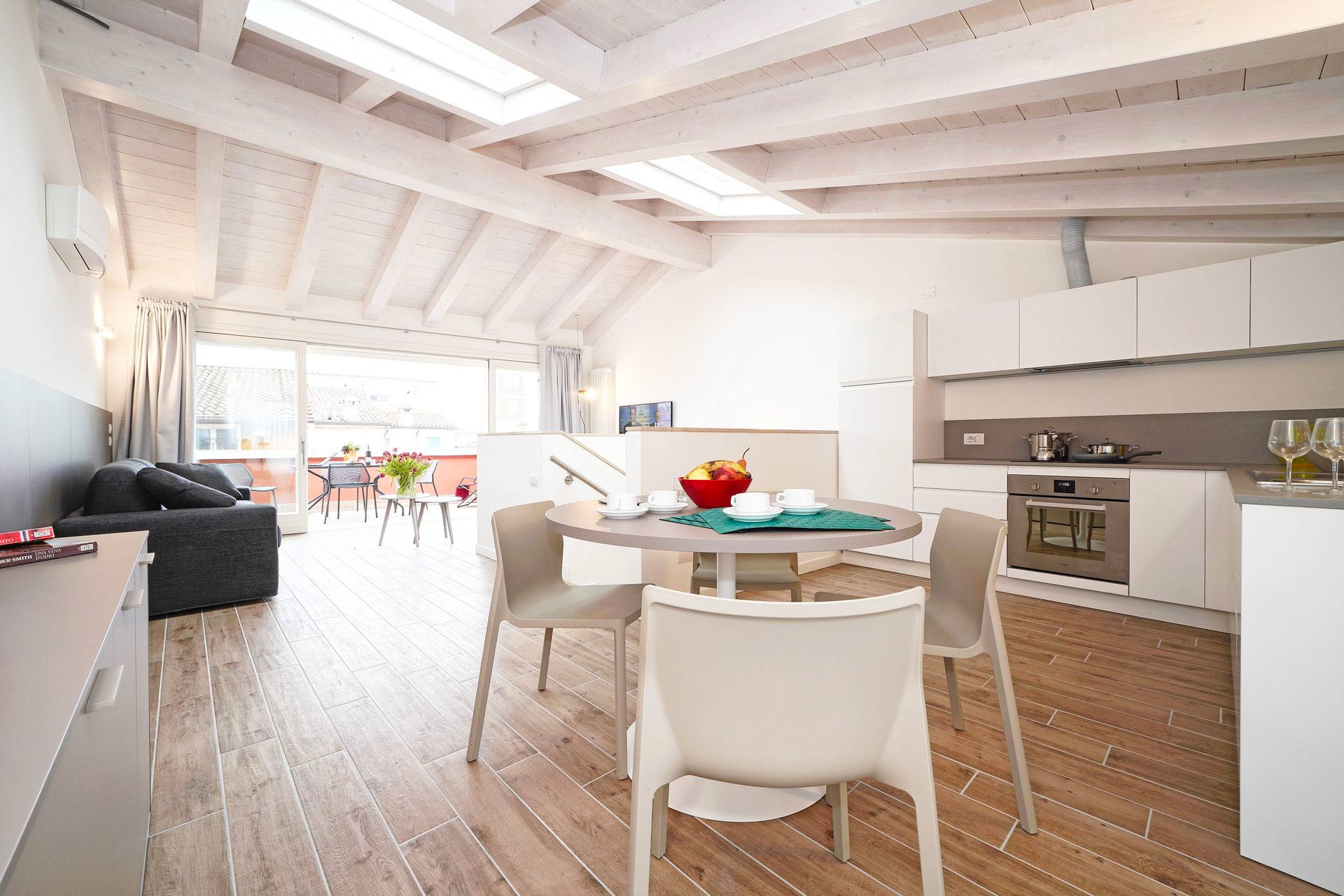 Piano attico, soggiorno con divano letto doppio, zona pranzo con cucina attrezzata, ampio terrazzo arredato con vista lago parziale, una camera doppia, una camera a due letti, 2 bagni completi (uno con vasca e uno con doccia).